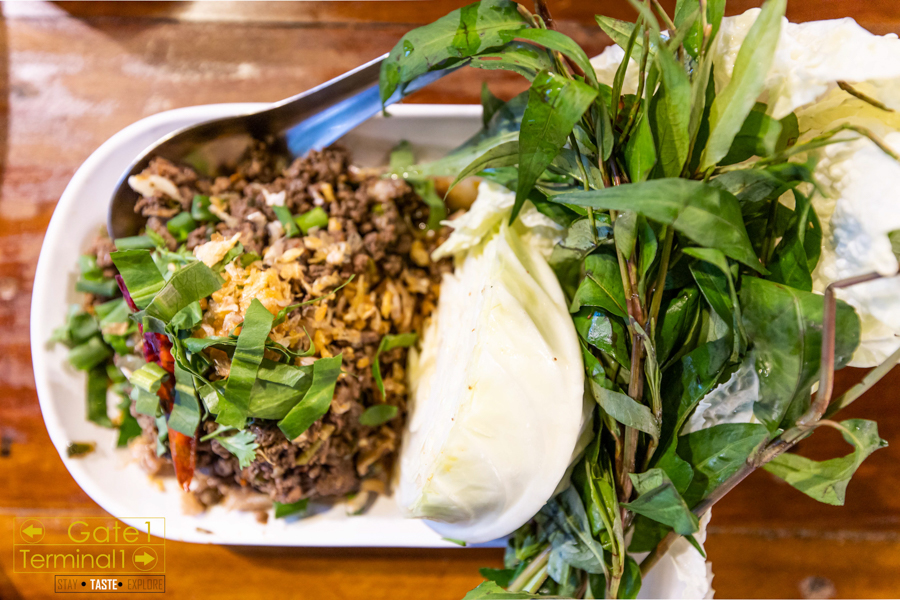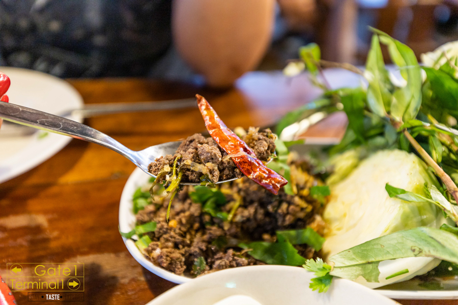 ลาบหมูคั่ว กลิ่นเครื่องคั่วหอม แห้งกำลังดี รสชาติไม่เผ็ดเหมือนลาบหมูของทางอีสาน ดังนั้น ใครชอบทานเผ็ด ต้องกัดพริกแห้งตาม ทานคู่กับผักแนม จานนี้ทานคู่เครื่องดื่มเย็นๆ ก็นั่งกันยาวๆไป