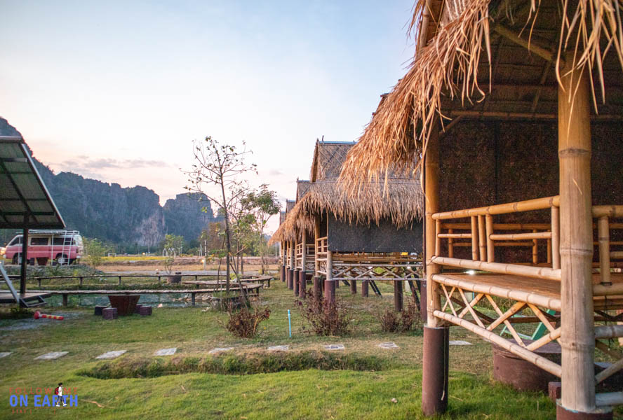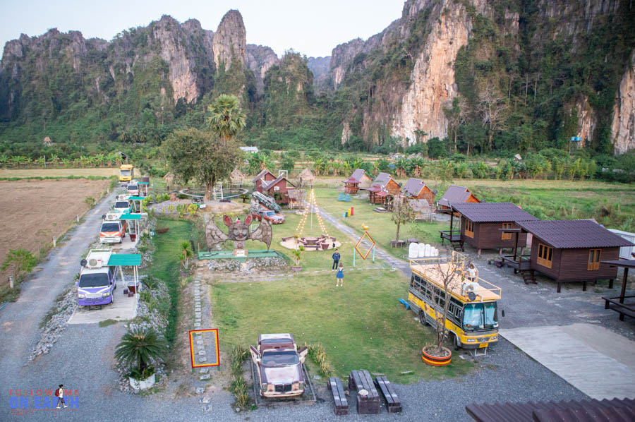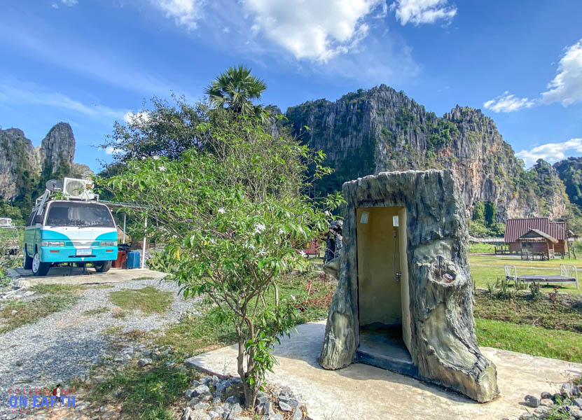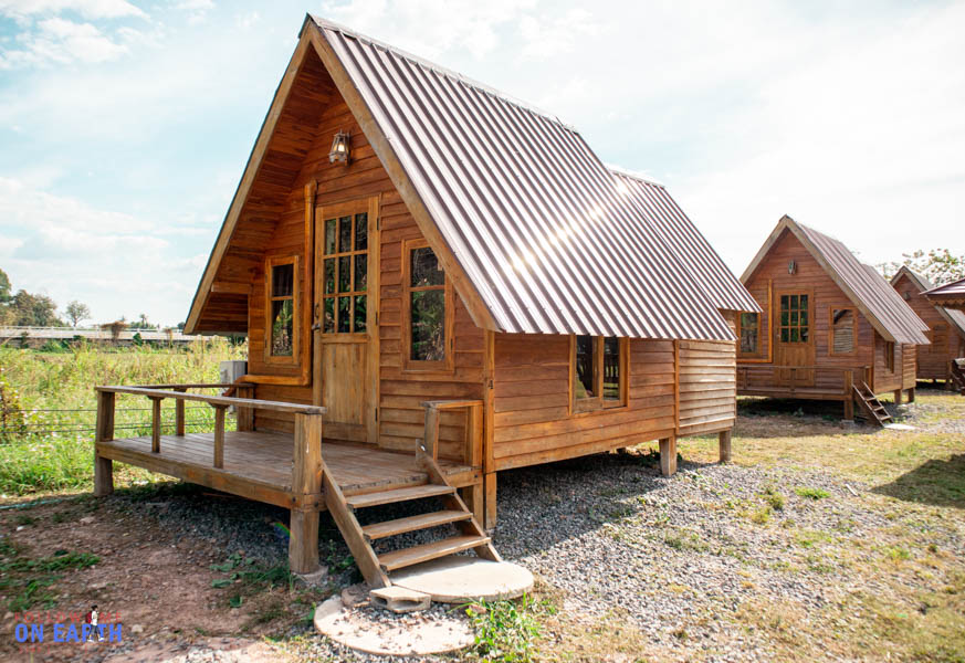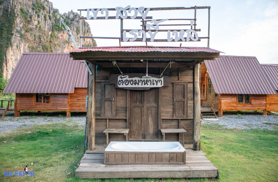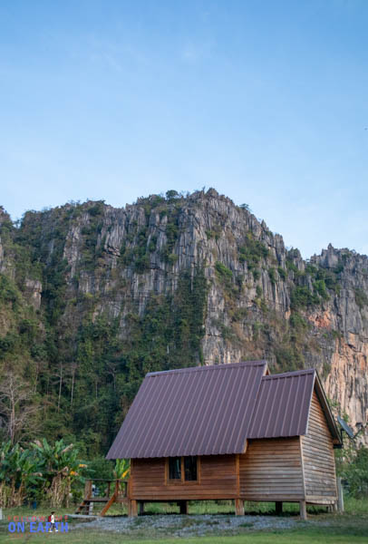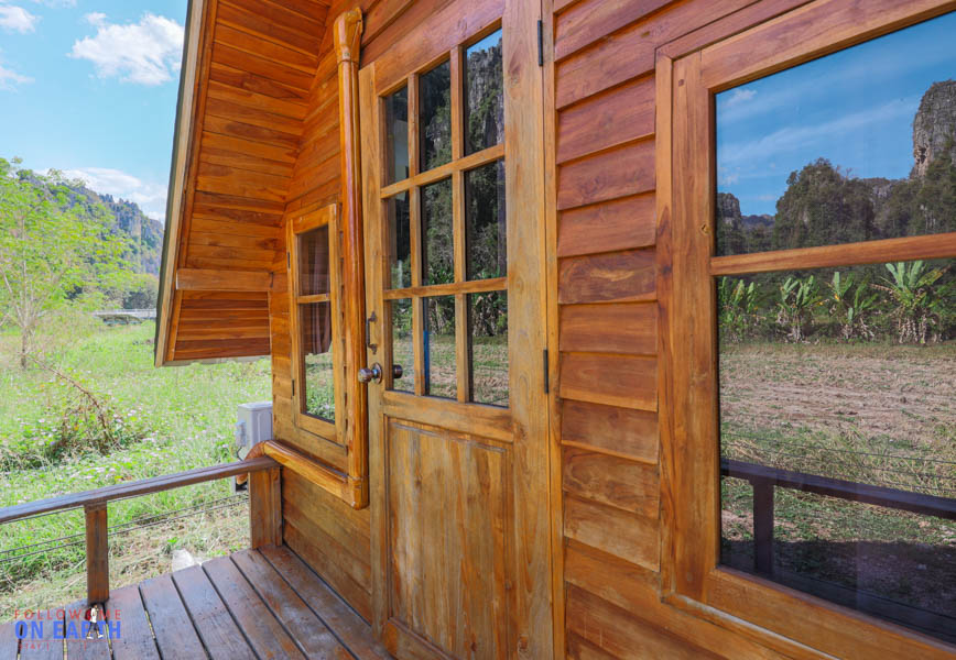 เราพักบ้านไม้สักหลังที่ 4 อยู่หลังสุดของที่พักเลย แต่วิวสวยมาก เพราะจะเห็นภูเขาหินเต็มๆตา