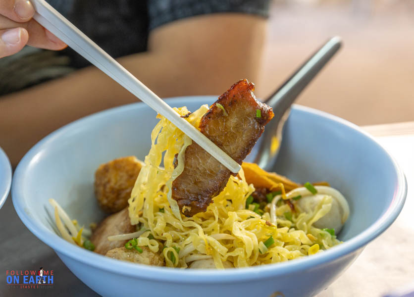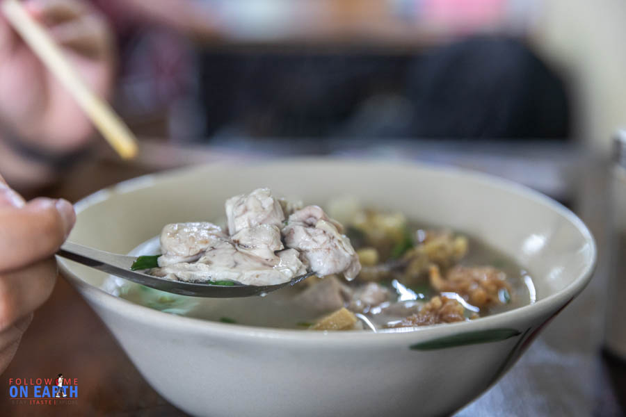 มาถึงร้านเกาเหลาสมองหมู ก็ต้องสั่ง "เกาเหลาสมองหมู ใส่ทุกอย่าง " ราคา 100 บาท ชามใหญ่ทีเดียว ในชามประกอบด้วย สมองหมู เครื่องในหมู ลูกชิ้นเผือก ลูกชิ้นปลา หนังปลากรอบ ลูกชิ้นหัวไชเท้านึ่ง, และเต้าหู้ยัดไส้