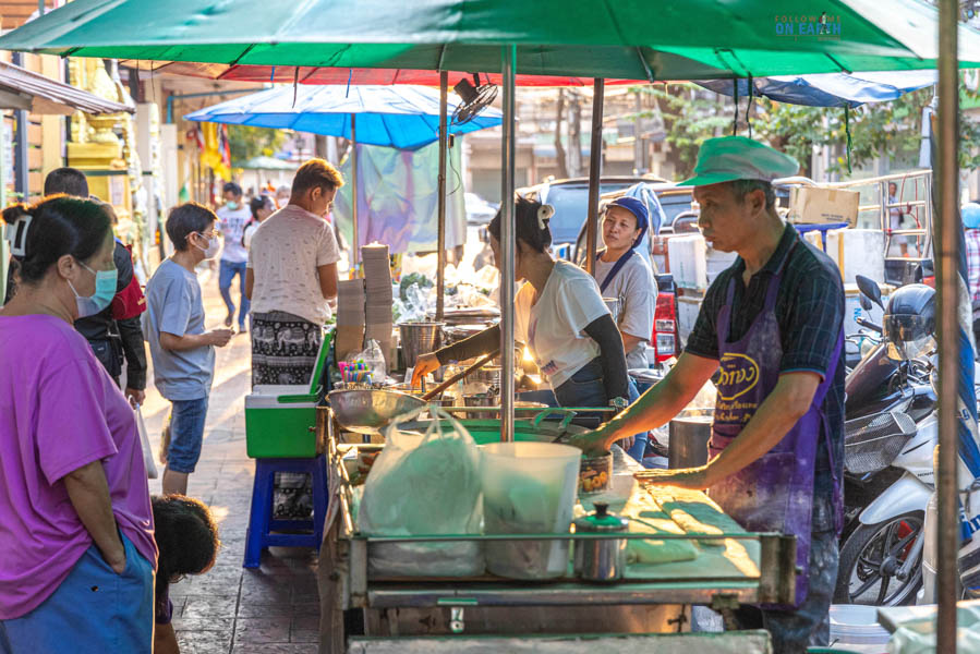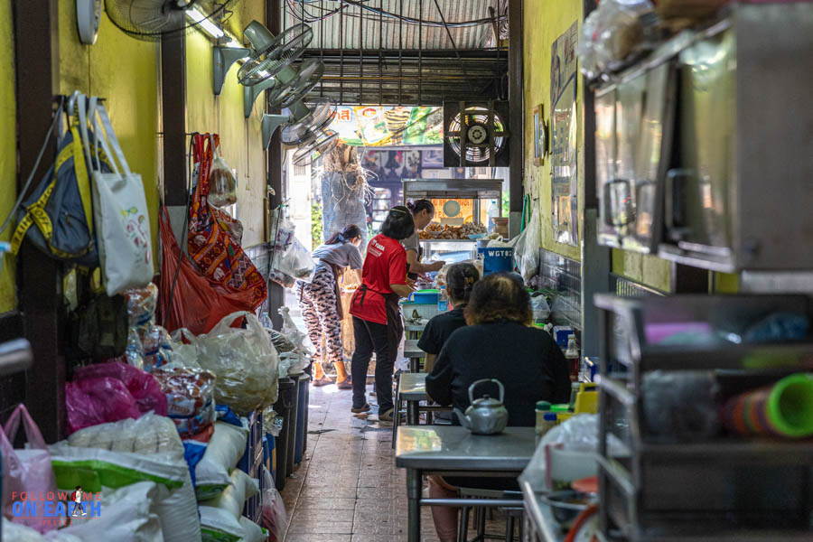 เดินมาข้างหลังวัดอินทารามวรวิหาร ตรงนี้เป็นซอยเทิดไท 10 เป็นซอยเลาะไปตลาดสด ร้านแรกสุดเป็นร้านขนมหัวผักกาดเจ้าเก่าวัดอิน คนรอเยอะมาก เจ้าของร้านผัดมือเป็นระวิง