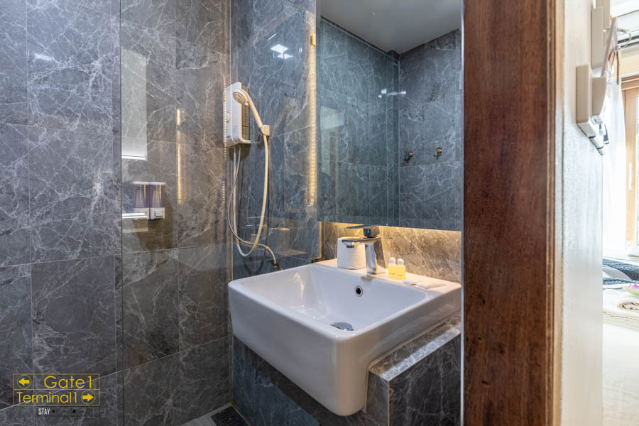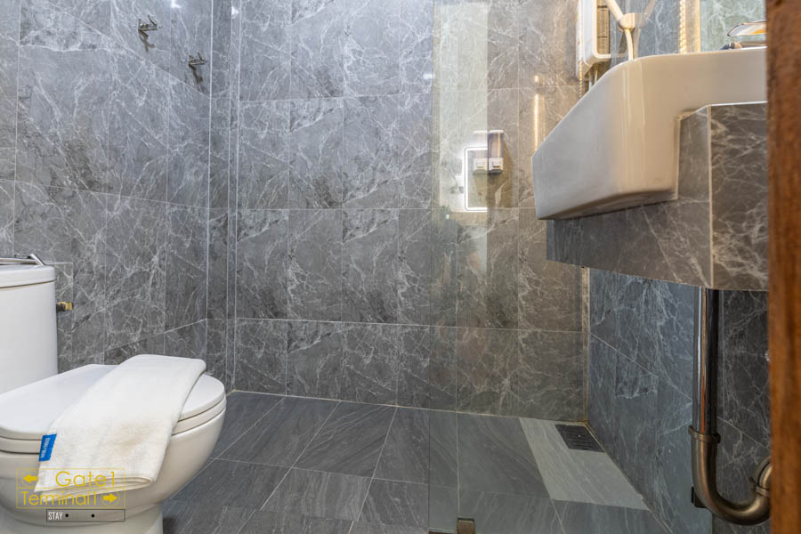 ส่วนห้องน้ำไม่กว้างมาก มีการแบ่งโซนแห้งกับโซนเปียก (เกือบ) จะชัดเจน มีเครื่องทำน้ำอุ่น ส่วนของใช้ในห้องน้ำจะมีแค่แชมพู กับ สบู่ เท่านั้น