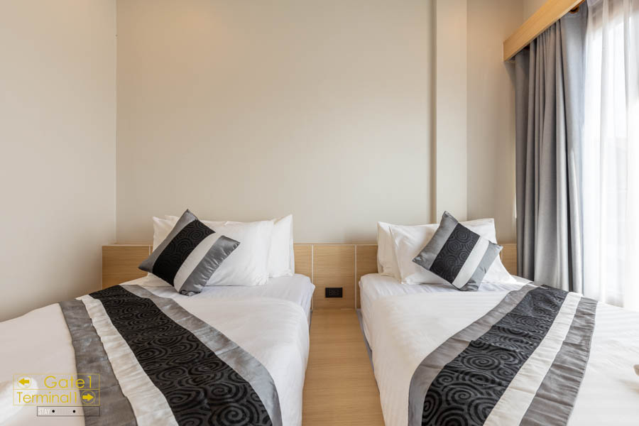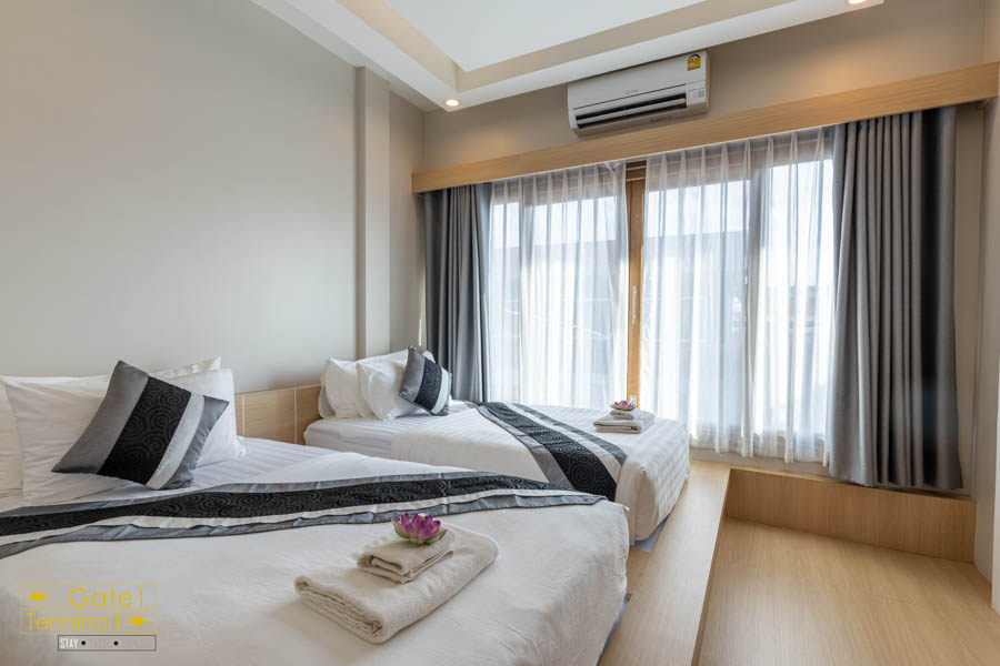 เข้าห้องมาเราเลือกเป็นเตียง Twin และบริเวณเตียงจะเป็นพื้นยกสูงอีกชั้นแทนเตียง การตกแต่งห้องแบบมินิมอล Japnese Style