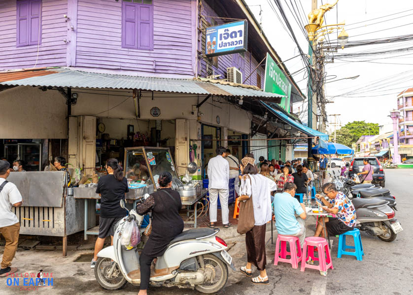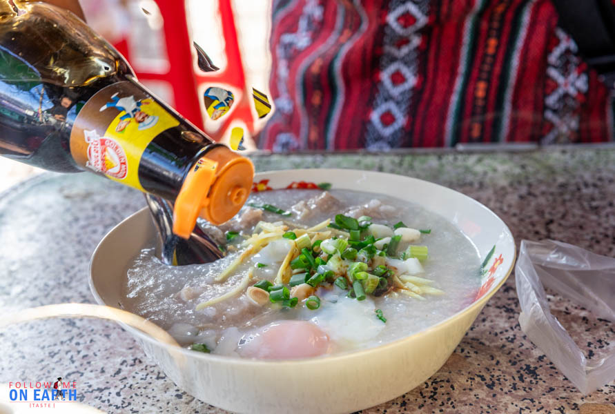 ร้านโจ๊กเล็กๆ อยู่ริมถนน แต่เป็นร้านเก่าแก่ขายมานานเกือบ 100 ปี และสิ่งที่แปลกตา คือ ร้านนี้ใช้กระทะในการต้มโจ๊กและน้ำซุปกระดูกหมูเข้มข้น อีกทั้งหมูสับชิ้นโต