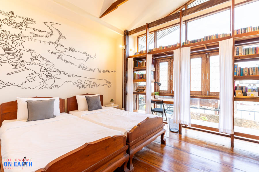 ห้องพักของเราวันนี้เป็นห้องใหญ่ สามารถนอนได้ 2-4 คน การตกแต่งเป็นเหมือนห้องสมุดน้อยๆ มีระเบียงให้นั่งชมวิวด้วย แต่ต้องระวังเรื่องการเดิน เพราะพื้นที่นี่ลื่นมาก