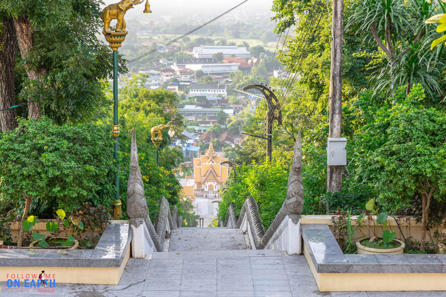 ทางขึ้นวัดมีอยู่ 2 ทาง คือ ขับรถขึ้นไปด้านบน จากเส้นข้างสนามกีฬา หรือจะท้าทายร่างกายตัวเอง โดยขึ้นบันได้ 449 ขั้นก็ได้
