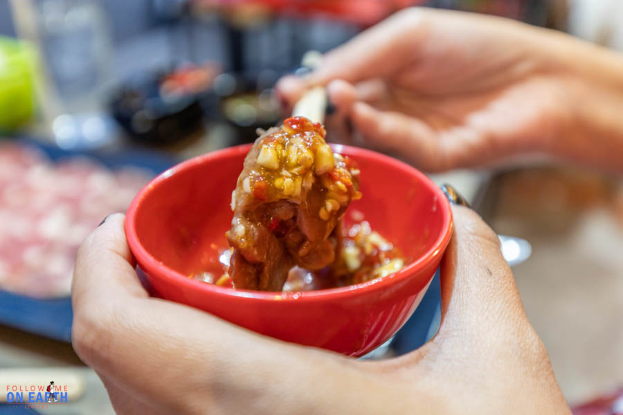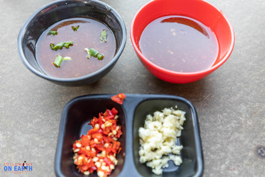 สั่งเสร็จก็จะมีน้ำจิ้มมาให้ 2 แบบ คือ น้ำจิ้มธรรมดา และน้ำจิ้มแบบมีดีวัวขมๆ (ถ้วยดำ) และพริกกระเทียมให้ 1 ชุด