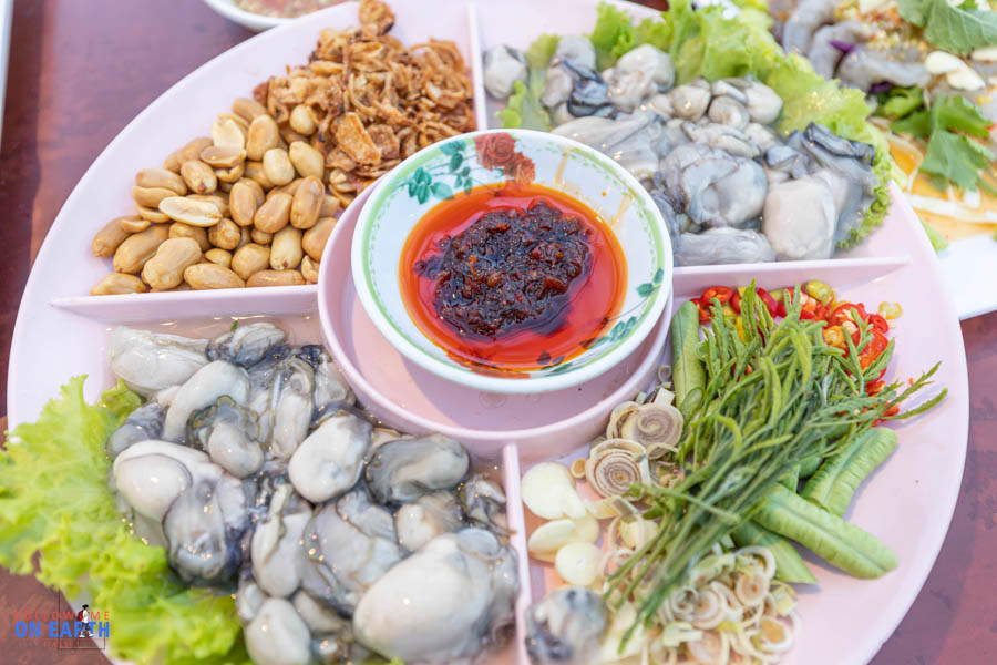 เมนูแรก หอยนางรมทรงเครื่อง จานใหญ่มาก ถึงแม้จะอยู่ภาคอีสานอาหารทะเลก็ต้องมีในเมนูของเรา หอยนางรมสดใช้ได้ เสริฟมาพร้อมน้ำพริกเผา