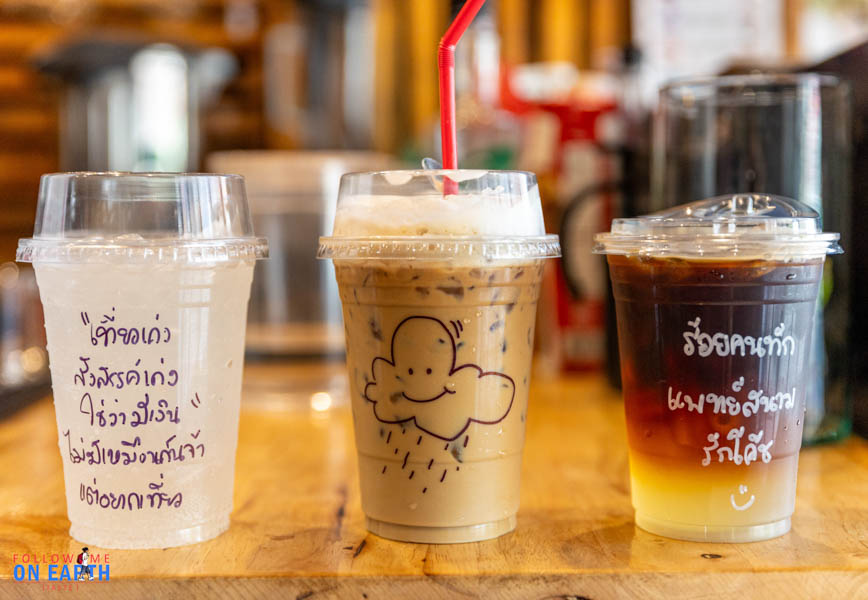 แต่ละแก้วก็จะมีข้อความน่ารักๆ ให้อ่านเพลินๆ วันนี้เราสั่ง มะนาวโซดา ลาเต้มิ้นต์คาราเมล ออเร้นอเมริกาโน่ (จากซ้ายไปขวา)