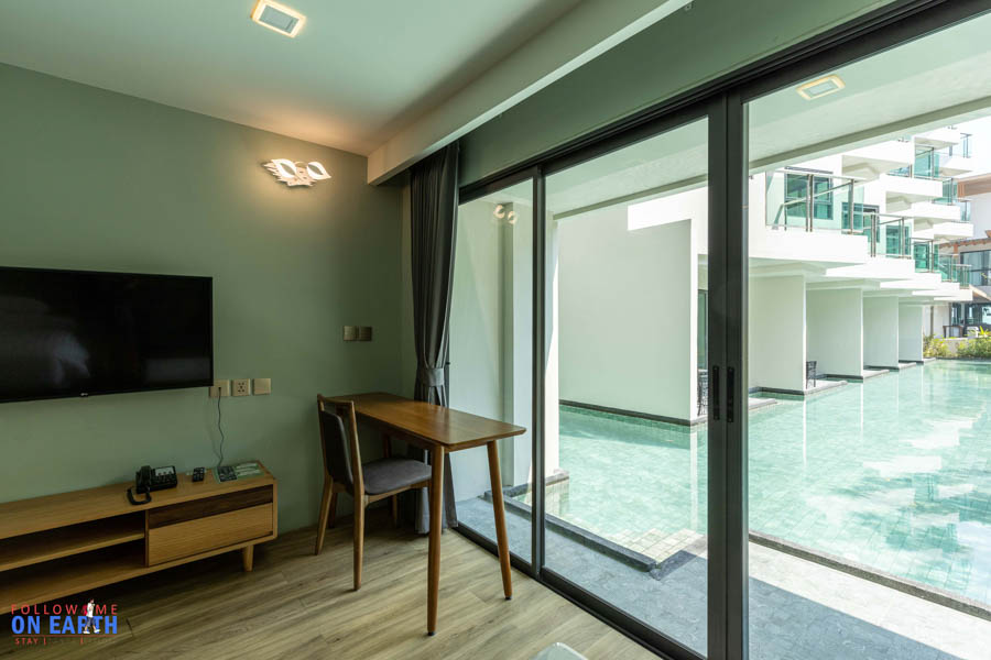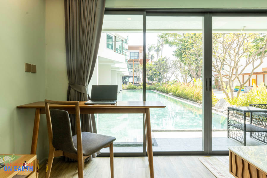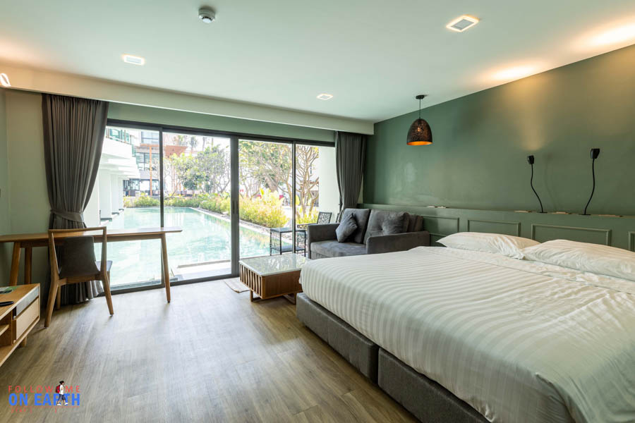 ห้องพักของเราวันนี้เป็นห้องแบบ pool access ขนาดห้องกว้างขวาง นอกจากเตียงนอนขนาดใหญ่แล้ว ยังมีที่เหลือไว้วางโซฟาอีก 1 ตัว แถมยังมีที่วางโต๊ะทำงานได้อีก 1 ชุด เปิดประตูออกไปก็ยังมีที่นั่งอีก 1 ชุดริมสระน้ำ