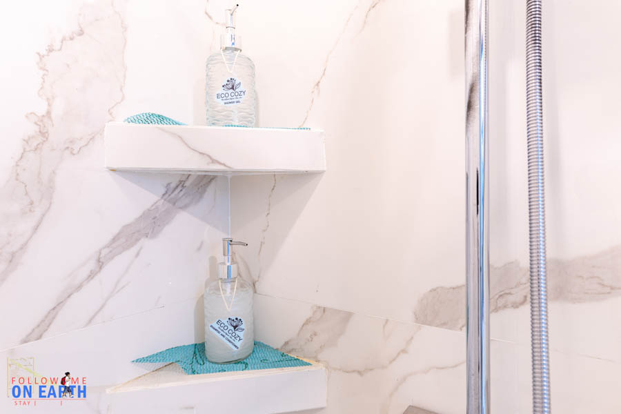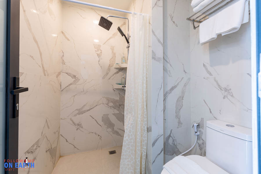 ห้องน้ำขนาดไม่ใหญ่โตแต่ก็ใช้งานได้สบายๆ อ่างล้างหน้าอยู่ด้านหน้าห้องน้ำ ความเก๋คือไฟกระจกเป็นระบบสัมผัสโดยจะมีปุ่มอยู่ที่หน้ากระจกเลย ในห้องน้ำมีสบู่และแชมพูเตรียมไว้ให้เรียบร้อย