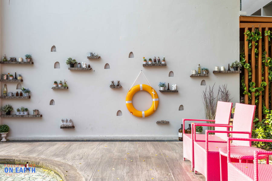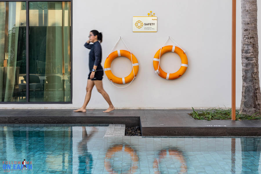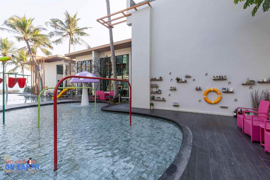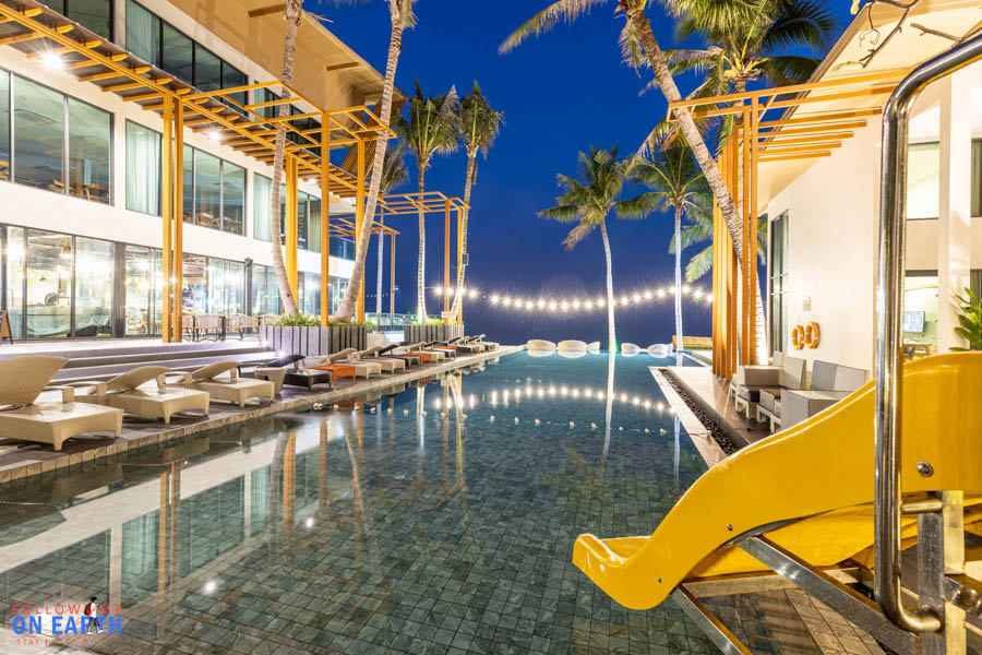 ข้อดีของสระว่ายน้ำที่นี่คือเห็นวิวทะเลแบบเต็มตาเลย เพราะโรงแรมติดชายหาดทำให้ไม่มีถนนหรือต้นไม้มาขวาง (มีต้นมะพร้าวอยู่ต้นเดียว) ข้างสระมีเตียงไว้นอนเอนหลัง ด้านหนึ่งมีสไลเดอร์เล็กๆด้วยนะ ส่วนเรื่องความปลอดภัยก็มีห่วงชูชีพไว้พร้อมข้างสระเลย