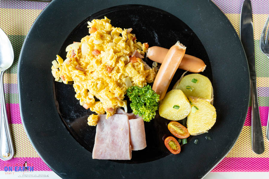 อาหารเช้าที่ห้องอาหารเดิม ในวันที่แขกพักไม่เยอะก็จะเป็นรายการอาหารให้เลือก สลัดและขนมปังมีให้ทุกโต๊ะ