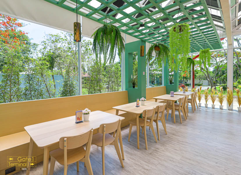 บรรยากาศภายในร้าน การตกแต่งโทนสีเขียวตัดกับเฟอร์นิเจอร์สีน้ำตาลอ่อน เพดานสูง กระจกบานใหญ่รอบร้าน ทำให้ร้านดูโล่ง โปร่ง ไม่อึดอัด
