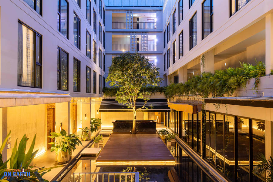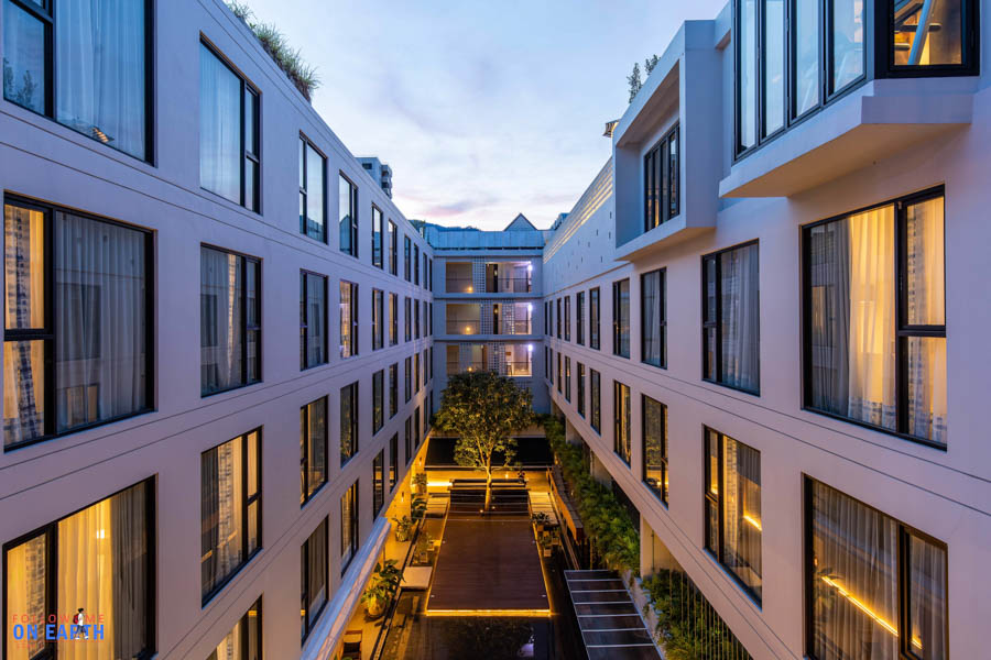 บรรยากาศยามเย็นของโรงแรม ตัวตึกเป็นรูปสีเหลี่ยมผืนผ้า มีพื้นที่โล่งตรงกลาง