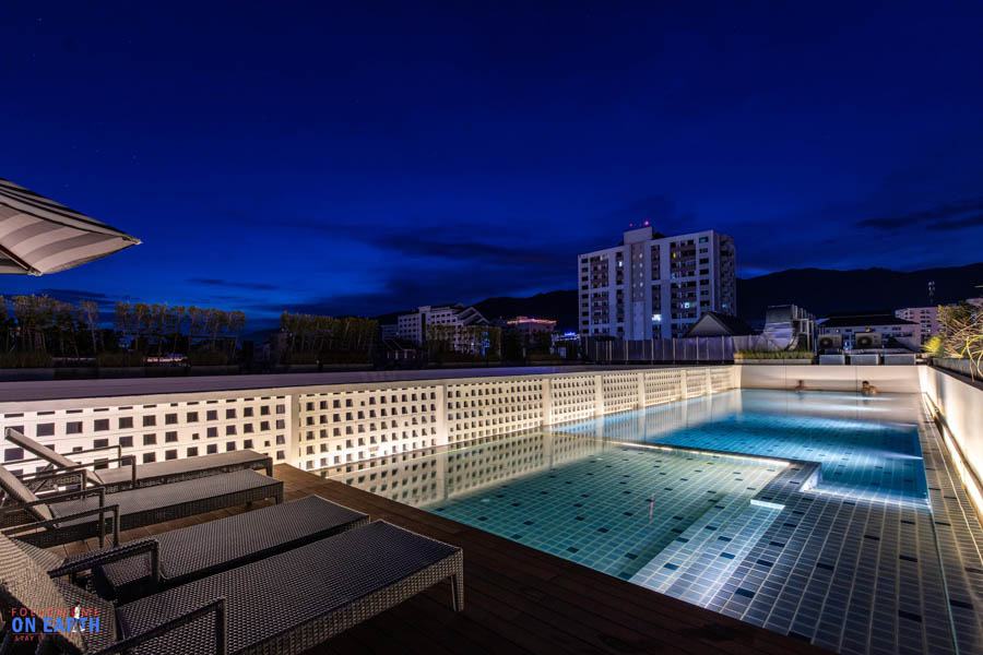 สระว่ายน้ำ อยู่ชั้นบนสุด ตอนเราไปถึงเป็นช่วงเย็น บรรยากาศด้านบน โรแมนติกดีทีเดียว แต่ถ้าเป็นตอนเช้าก็จะเห็นวิวภูเขาชัดเจน ถึงแม้ว่าจะอยู่ในตัวเมืองก็ตาม