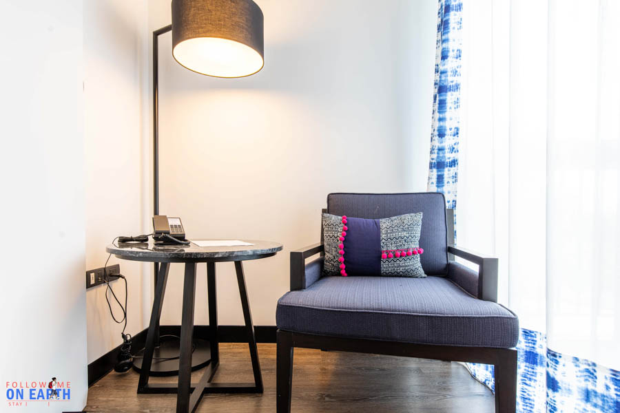 บริเวณมุมห้องก็จะมีเก้าอี้สำหรับพักผ่อนอีก 1 ตัว พร้อมโคมไฟขนาดใหญ่ ให้นั่งพักผ่อน