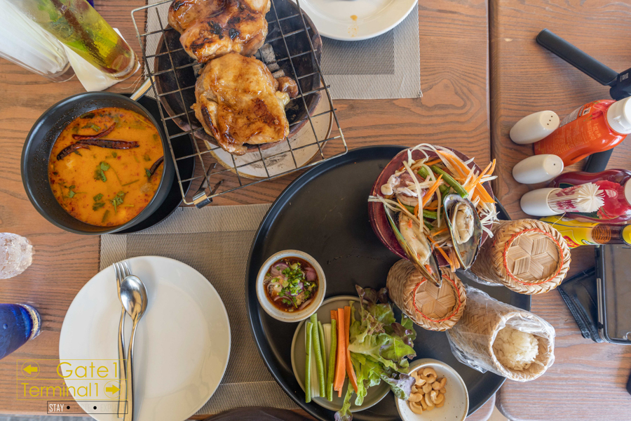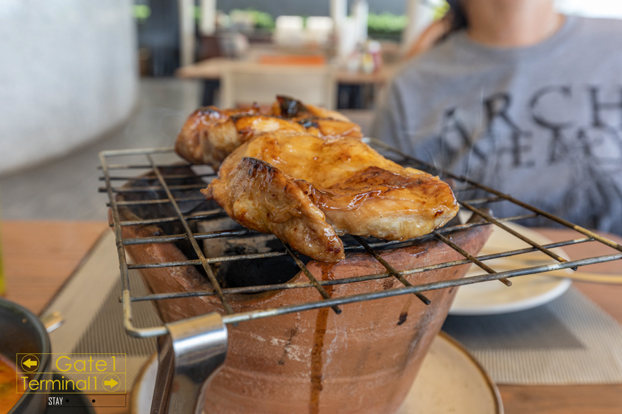 ส่วนไก่ย่าง ย่างมาบนเตาอั่งโล้เลย รับรองว่าร้อนแน่นอน แแม้โดนลมทะเล ตัวไก่ รสชาติดีเลย เนื้อนุ่ม และหมักไก่ออกรสชาติหวานๆ เด็ก หรือ คนไม่ทานเผ็ด น่าจะชอบเมนูนี้