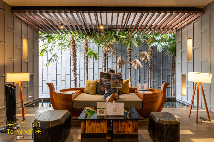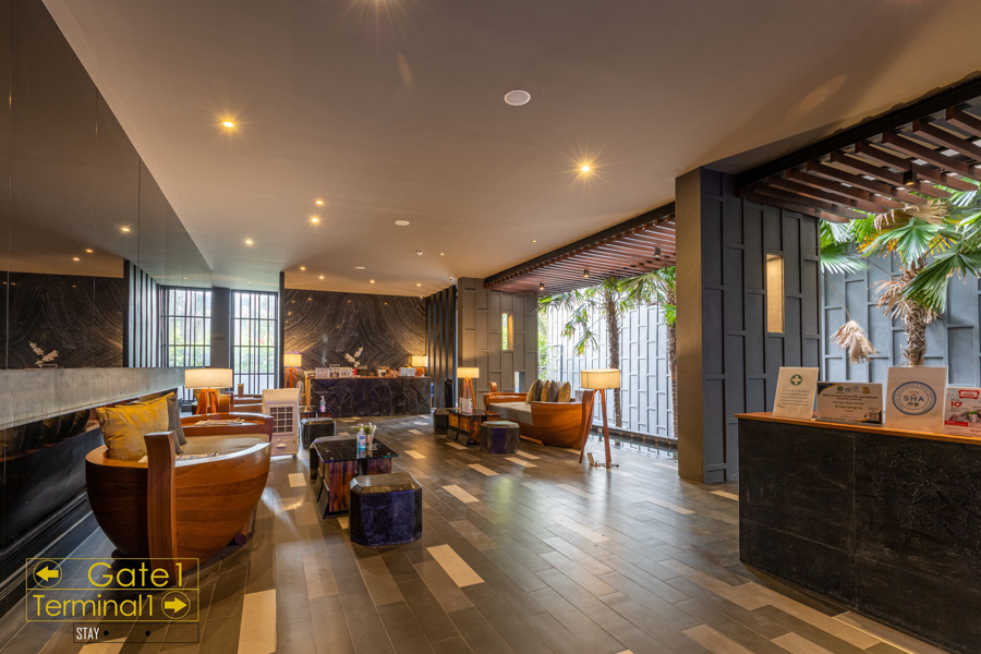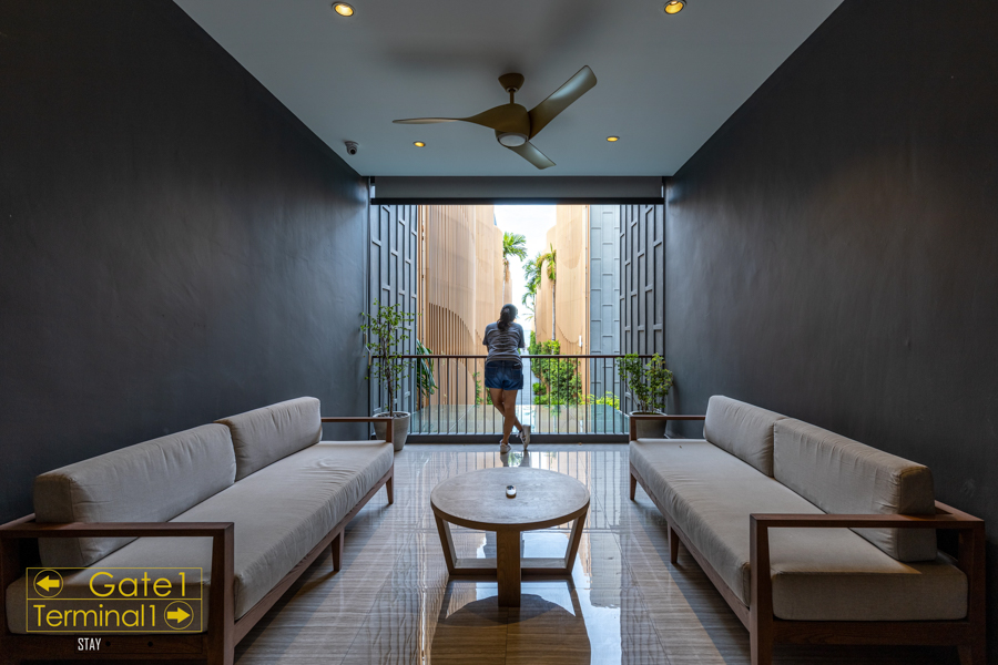 บริเวณ Lobby ตกแต่งสีดำ ตัดกับสีขาว ทอง ดูหรูหรา ถึงแม้จุดนี้จะไม่มีแอร์ แต่ก็ไม่ร้อน เพราะเป็นพื้นที่โล่ง โปร่ง ลมพัดเข้าตลอดเวลา