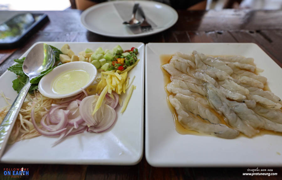 กุ้งแช่น้ำปลา การเสริฟก็แปลกตากว่าร้านอื่นๆ เพราะกุ้งกับเครื่องแยกมาคนละจาน น้ำปลาที่แช่กุ้งมาเค็มแต่ก็ออกหวานนิดๆ