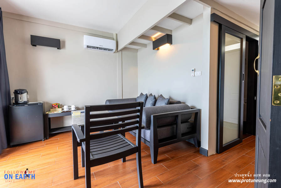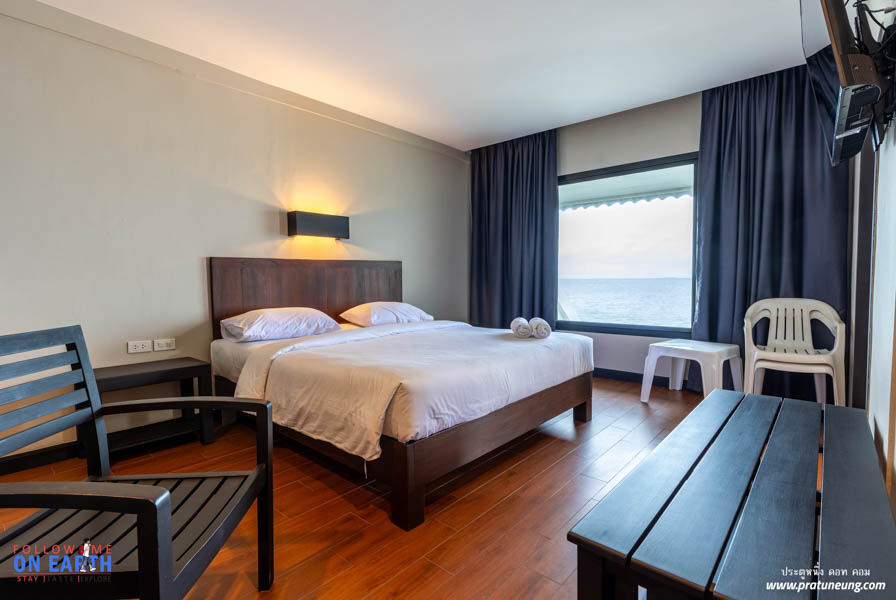 ที่พักเราพักโซนบ้านพักริมทะเล มีระเบียงเห็นวิวทะเลได้ มีห้องนั่งเล่น ห้องนอนแยกจากกัน บรรยากาศดีมาก
